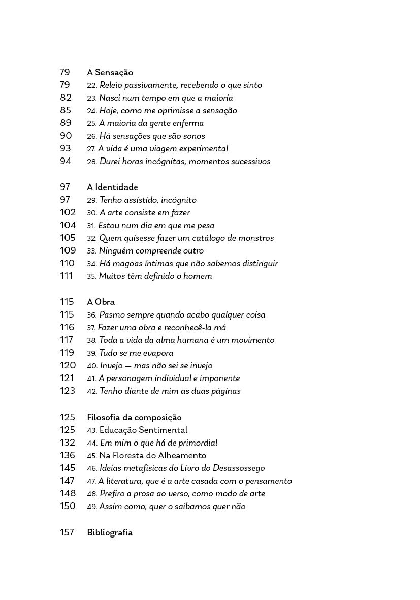 A presente antologia essencial do Livro do Desassossego reúne um prefácio escrito pelo próprio Pessoa e 49 fragmentos representativos da obra, congregados em sete temas — «A Vida Moderna», «O Devaneio», «A Cidade», «A Sensação», «A Identidade», «A Obra» e «A Filosofia da Composição» —, pensados no seu conjunto como um mapa para navegar pelo universo poético do autor.
