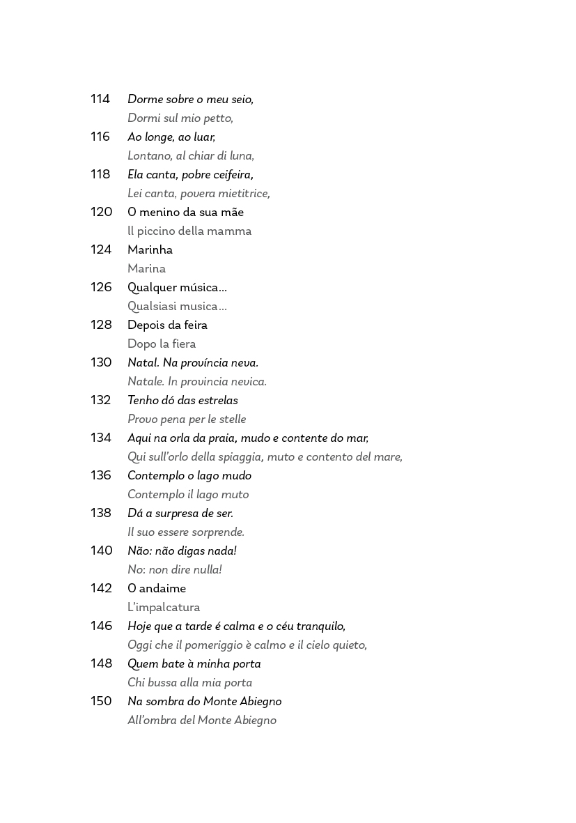 Poesia. Prima antologia offre ai lettori un’edizione bilingue della prima antologia dell’opera poetica di Fernando Pessoa, curata da Adolfo Casais Monteiro negli anni Quaranta. L’opera comprende una raffinata selezione di poesie, arricchita da testi in prosa dell’autore, tra cui la lettera che Pessoa scrisse allo stesso Casais Monteiro per spiegare l’origine dei suoi eteronimi. Questa edizione include una prefazione di Valeria Tocco e un saggio di Eduardo Lourenço.